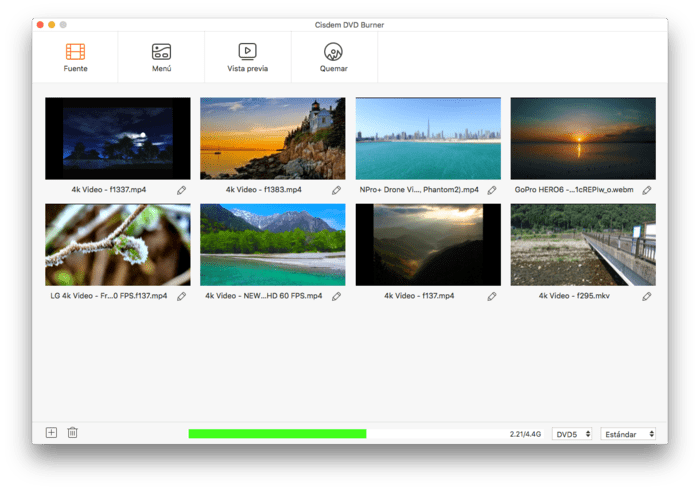 Cisdem DVD Burner admite la grabación de DVDs de casi todos los formatos de videos, como MP4, AVI, MOV, MKV, WMV, MPEG, 3GP, VOB, FLV, M2TS, MTS, TS, SWF, MPG, MPA, DAT, DV, NSV, QT, RMVB, DivX, DV, etc., incluido el último formato de video 4K/5K UHD. Además, admite videos descargados de YouTube, Facebook, Twitter, Vimeo, Dailymotion, etc. y videos grabados tomados por videocámara, cámara, iPhone, iPad y otros dispositivos.