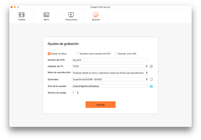 Cisdem DVD Burner puede grabar videos en un disco DVD directamente, todos los formatos de DVD son compatibles, incluidos DVD-9, DVD-5, DVD-R / RW, DVD + R / RW, DVD + R DL, DVD-R DL, DVD- RAM y más. También puede convertirlos a una carpeta de DVD y reproducirlos como un DVD genuino o hacer una copia de seguridad de los archivos en un archivo ISO para su posterior grabación. Muestra en tiempo real el tamaño del archivo de DVD y la capacidad del disco en diferentes configuraciones de calidad de video, lo que garantiza una grabación de DVD exitosa sin exceder la capacidad y sin desperdicio en sus discos. Obtenga su DVD formateado en NTSC, PAL TV estándar o según su región para una reproducción fluida. También elija entre varios modos de reproducción para habilitar un comportamiento de reproducción de DVD esperado. ¿Deja la grabación de DVD sin terminar y quiere continuar la próxima vez? Guarde la grabación de DVD actual como archivo de proyecto y continúe más tarde. Incluso permite grabar sus videos en múltiples copias de DVD sin tener que repetir un tedioso proceso de grabación.
