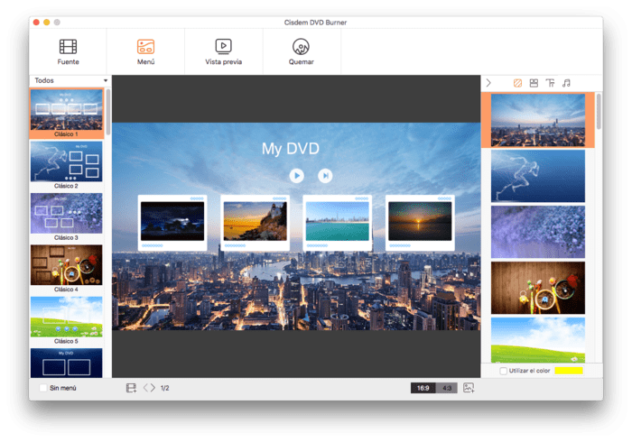 Cisdem DVD Burner proporciona varias plantillas de menús de DVD gratuitas para diferentes ocasiones y eventos, como Clásico, Navidad, Año Nuevo, Día de San Valentín, Cumpleaños, Boda, Graduación, Deportes, Bebé, Viajes y más. Puede seleccionar fácilmente uno que se adapte al tema de su DVD o simplemente prescindir de un menú. Además, puede establecer la relación de aspecto del video y personalizar el menú del DVD. Hay 2 relaciones de aspecto comunes: 16:9 para pantalla ancha y 4:3 para pantalla completa. Puede seleccionar el fondo del menú de color sólido o imagen importada, mostrar el botón de título como Marco o Etiqueta, mostrar el botón de menú como Icono o simplemente ocultarlos, editar el texto del menú y definir su fuente, tamaño y color. Para obtener más creatividad, incluso puede agregar su música de fondo favorita y aplicar el efecto de fundido de entrada/salida.