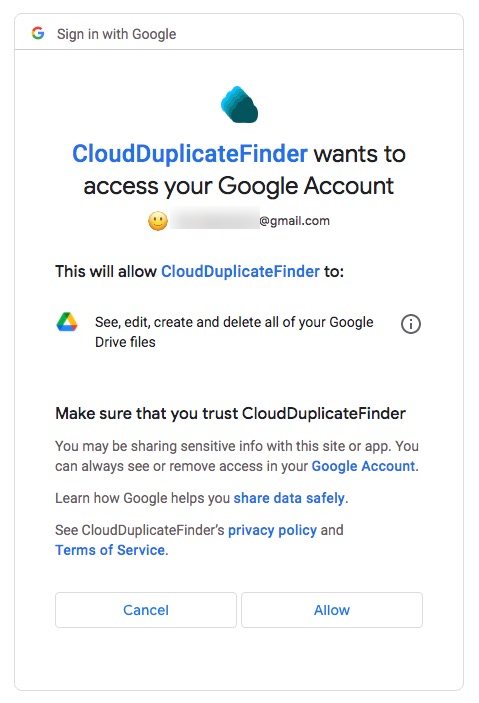 - Para utilizar Cloud Duplicate Finder, primero asegúrate de que confías en él. Tendrás que permitirle acceder a tu cuenta de Google, lo que le dará permiso para acceder, editar y eliminar todos tus archivos de Google Drive.