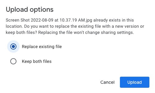 Ahora Google puede omitir las subidas duplicadas. Si vuelves a subir un archivo a Google Drive, o si tu cuenta ya tiene un archivo cuyo nombre y formato es el mismo que el del archivo que estás subiendo, esta subida será detectada e ignorada. Además, verás un cuadro de diálogo "Opciones de subida".