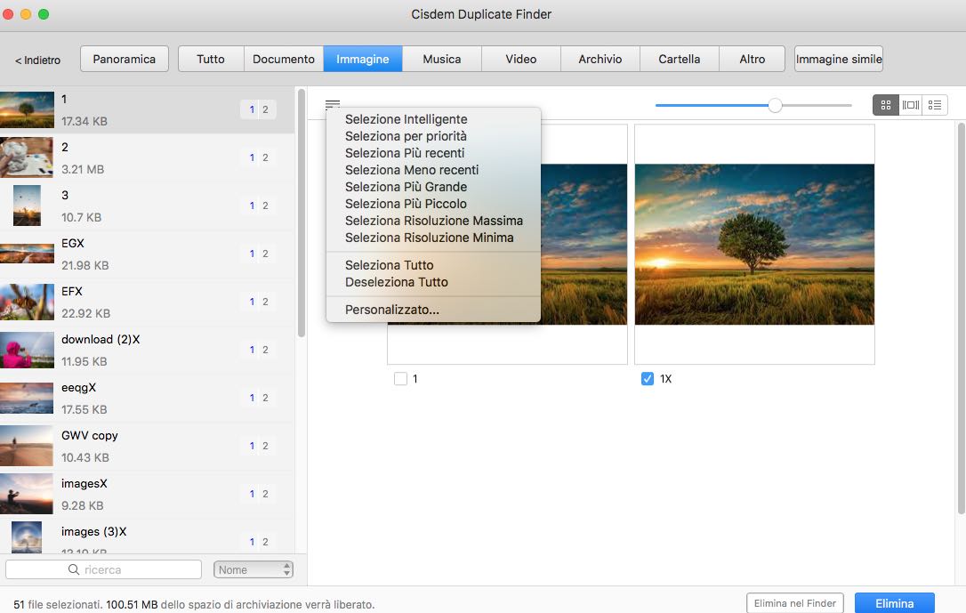 - Seleziona automaticamente tutti i file tranne uno per l'eliminazione in ogni set di file duplicati