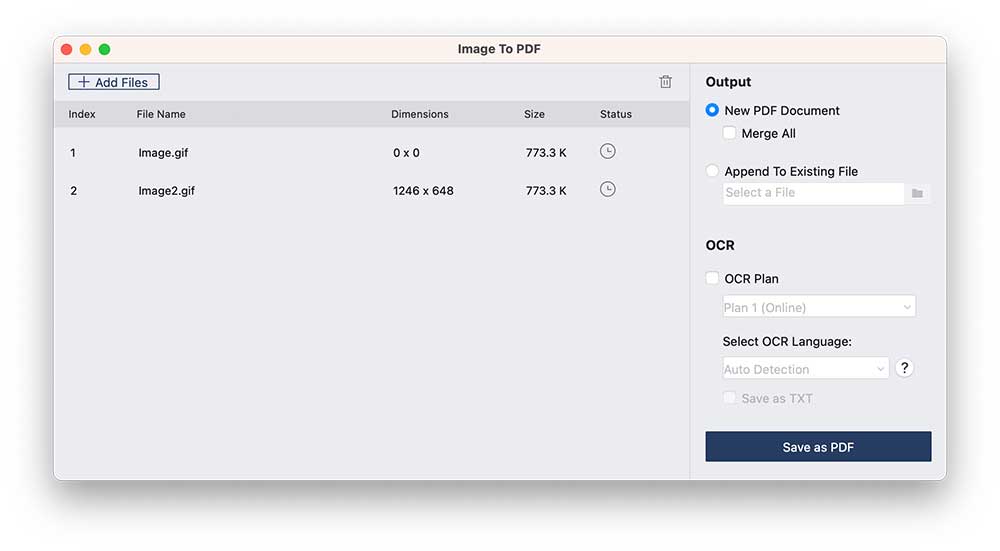- Turn the "Merge All" feature ON if you want to combine imported files into one PDF. Click "Save as PDF" to create PDF from imported files.