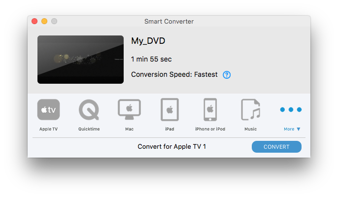 If you are looking for a free Video Converter for Mac, then Smart Converter is our top recommendation. Just as its name, this app is lightweight yet reliable, it offers presets for an extensive list of Apple devices. The output quality is good, and it will automatically send converted videos to iTunes or AppleTV. Though it has the longest converting times compared to other paid converter apps.(took about 2 hour to convert a 53:05 minutes video)