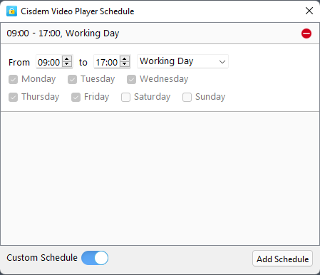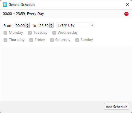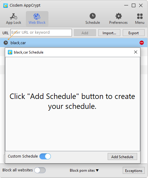 Cisdem AppCrypt blocks the added apps and websites all the time by default (the schedule is from 00:00 -23:59 every day by default), but you are also allowed to change the defaulted schedules to block those apps and websites at a certain period, you can either set a general schedule on all the apps and websites or set individual schedules on some specific apps or websites.