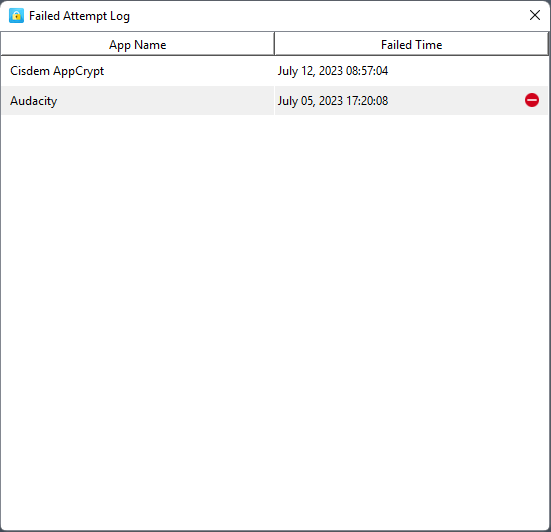 Cisdem AppCrypt records all the attempts to open the locked apps by entering the wrong password and displays the app names and time of failed access in the list. You can check the failed attempt log by clicking Menu > Failed Attempt Log