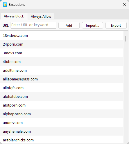 If there were any websites that you want to prevent or access always, you can click the Exceptions to get into the Exceptions window and add the websites that you want to block/allow always.