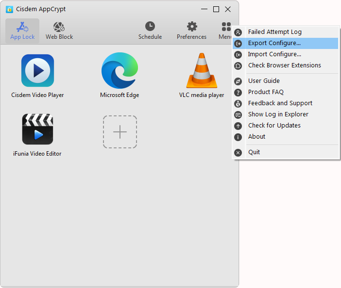 Step 1 After setting up the locked apps and blocked websites on one of your computer, go to the main window of Cisdem AppCrypt, click Menu > Export Configure to export a file with extension .acconf.