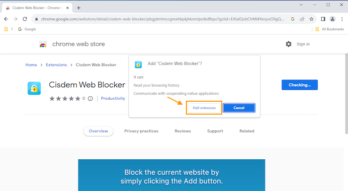 Click Add to confirm adding Cisdem Web Blocker extension on the following small window at the right upper corner.