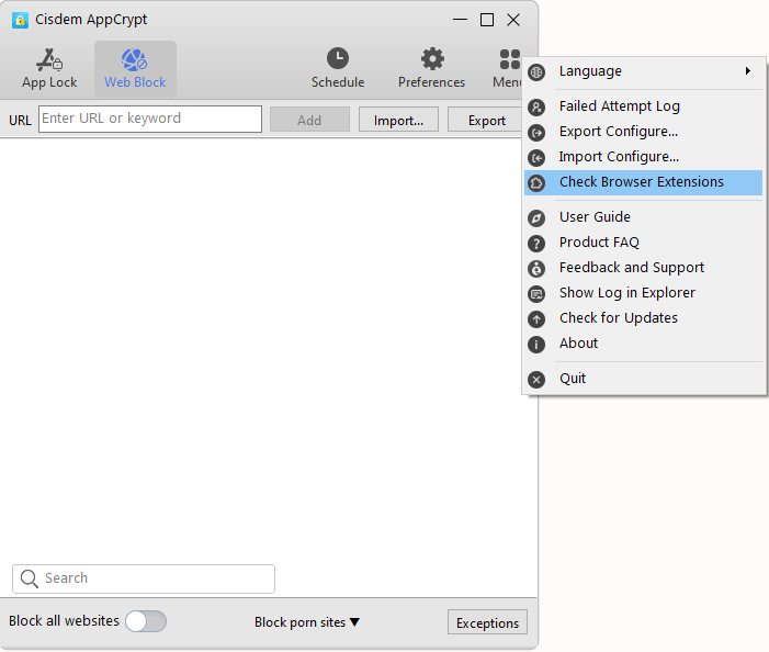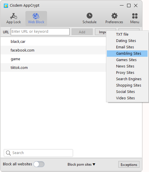In addtion to adding websites into the block list, Cisdem offers two more ways to block the websites, Exceptions and Block all websites.