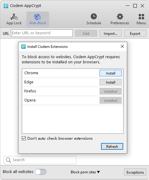 to download and install the extensions for different browsers (Cisdem supports blocking websites on Chrome, Edge, Firefox, Opera and Brave).