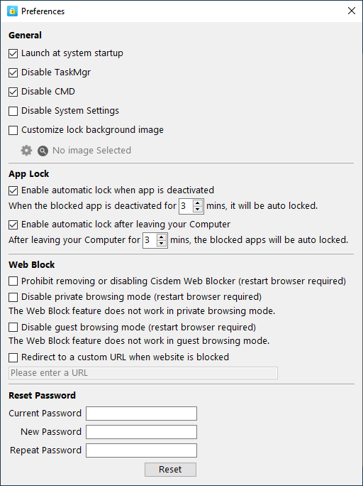 b. Disable TaskMgr/Disable CMD/Disable System Settings: To ensure Cisdem AppCrypt works more safely and efficiently, Cisdem AppCrypt automatically locks 3 security apps (TaskManager, Command and System Settings), if you don't want to lock these three apps, you can just uncheck them here.