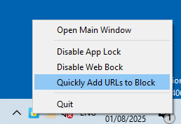 If you want to add new website or keyword without entering a password to access the main window of Cisdem AppCrypt, you can right click the padlock icon on the task bar and choose "Quickly Add URLs to Block"
