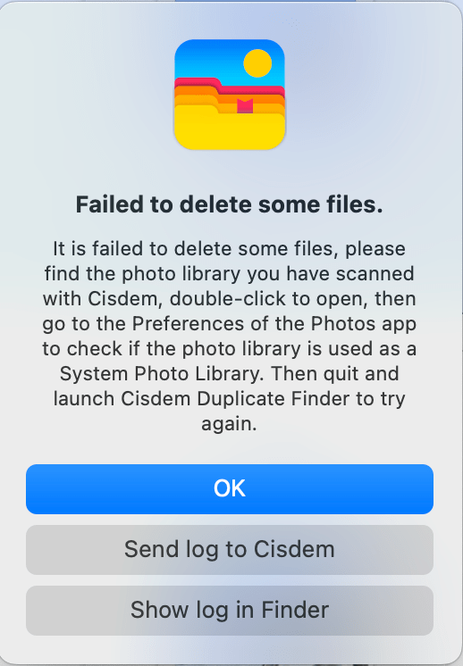 Cisdem Duplicate Finder can only delete images from a photo library, you can locate the photo library according to the path that the log file refers, double click to open it, go to the Preferences of the Photos app, click "Use as System Photo library" to turn the button gray, and then try to delete again.
