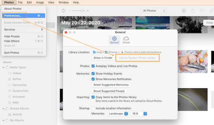 Cisdem can only delete files from a system photo library, so before hitting the Delete button, please confirm your photo library is set up as a system photo library. You can just double click the target photo library to open it, click Photos> Preferences on the top menu bar, click "Use as System Photo Library" as the screenshot shown below, if the button is grey, which means the photo library is a system photo library already.