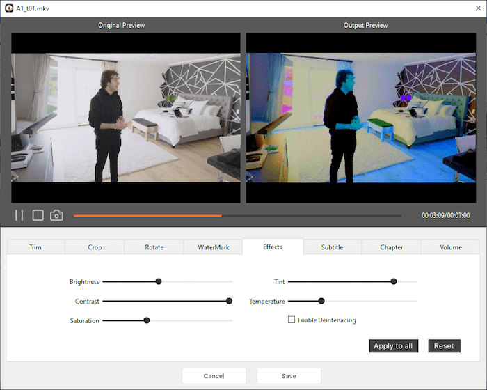 1. Navigate to Effects tab, set the degrees of Brightness, Contrast, Saturation, Tint, Temperature by resetting their respective control sliders.