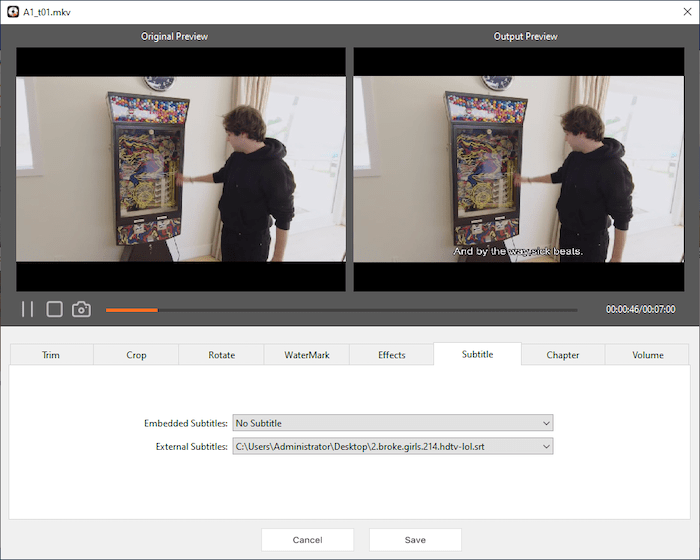 Navigate to Subtitle tab, and then you are able to select embedded subtitles the video includes or import an external subtitle files from your local drive.