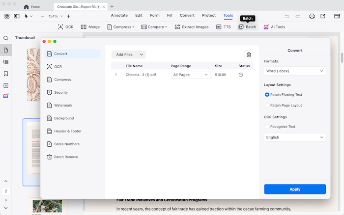 Instead of loading documents one by one, you can drag a whole folder into Cisdem PDFMaster. You can get into the Batch Processing window by taping Tools>