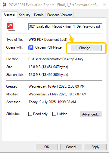 1. Right click any PDF file and choose Properties > Change, select Cisdem PDFMaster.