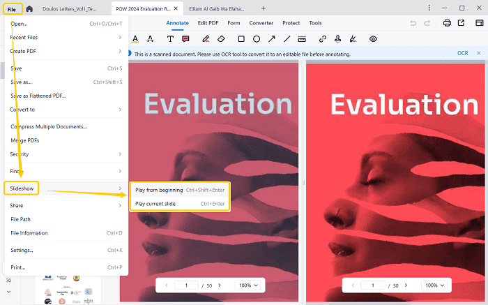 You can directly view the PDF file like a Keynote/presentation with the slideshow function of Cisdem PDFMaster. Just click File> Slideshow or directly press the shortcut keys (Ctrl+Shift+Enter/Ctrl+Enter) to play your PDF from beginning or the current page.