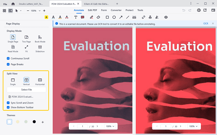 If you compare two parts of the same file side by side and work with both simultaneously, you can use the Split View function. You can choose to view vertical or Horizental by clicking the corresponding icons on the left side panel.