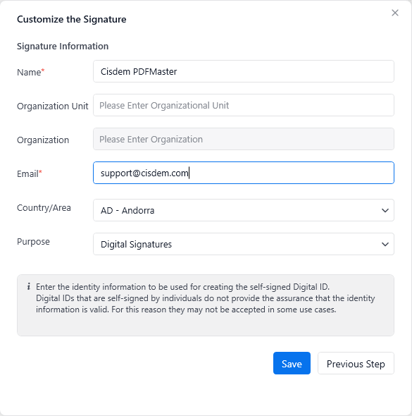 Step 3 Enter your identity information in the pop-up window and click Save.
