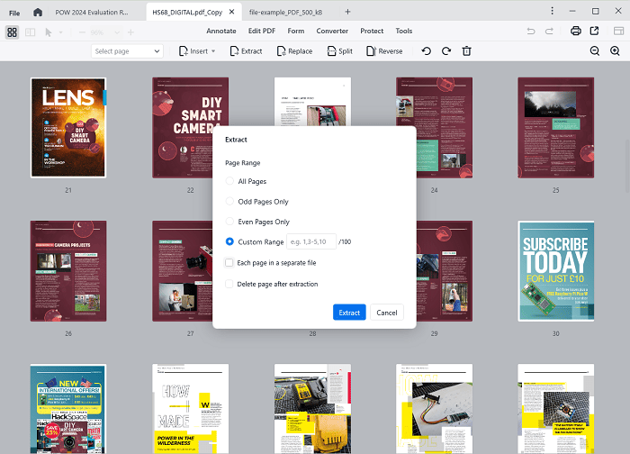 , it allows you to choose the page range that you want to extract, also you can choose to extract all the pages into a single PDF or each page in a seperate file.