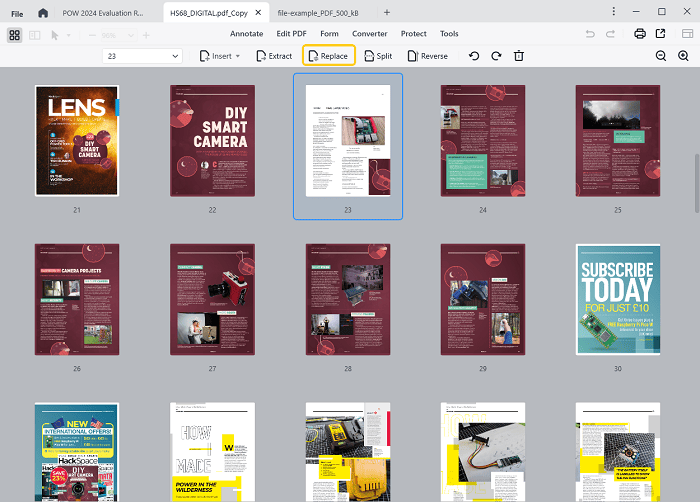 : It can help you to replace some pages from the current PDF file with the pages from another PDF file. Just highlight the pages that you want to replace, click