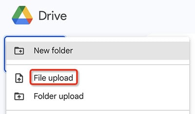 - In your Google Drive, hit “+ New” > “File upload” to add a video.