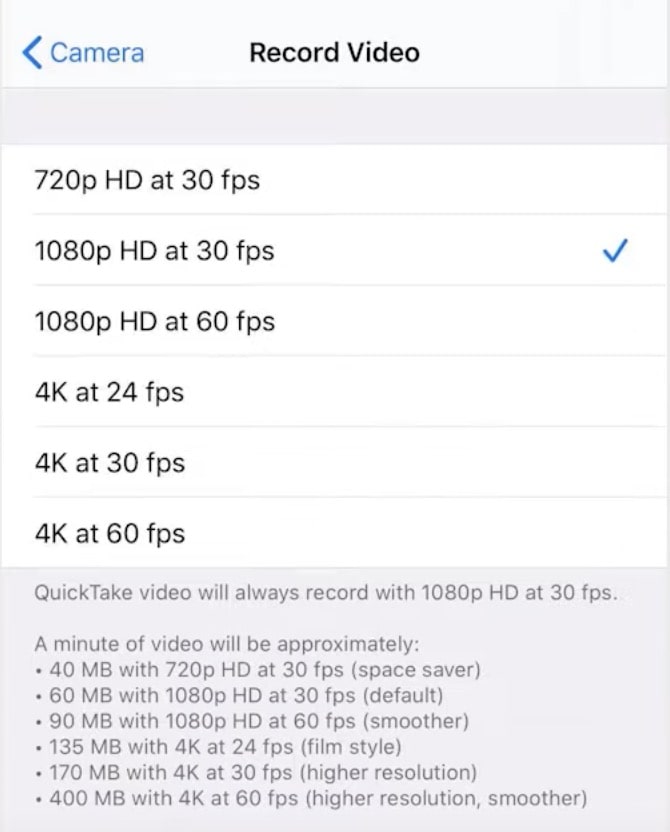 Go to “Settings” > “Camera” > “Record Video”. Then, you can choose the video resolution from 720p HD at 30 fps to 4K at 60 fps. The higher the resolution, the more megabytes are generated when recording the video. So, don't ever set the resolution to 4K. 1080p HD at 30 fps is sufficient.