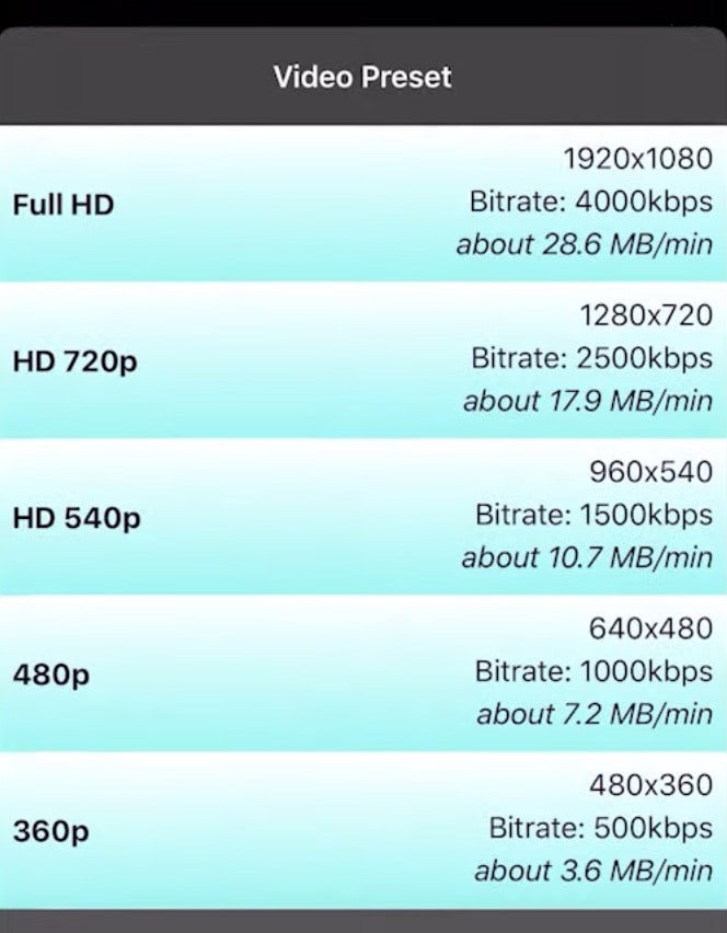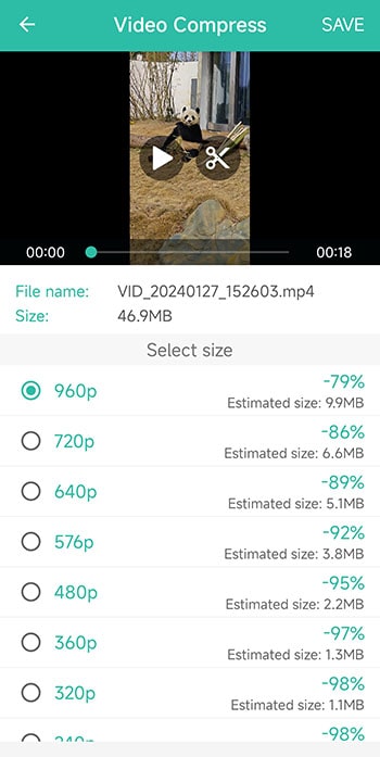 Step 4. Select a resolution from 144p to 960p, each of which estimates the output file size. Tap “SAVE”.
