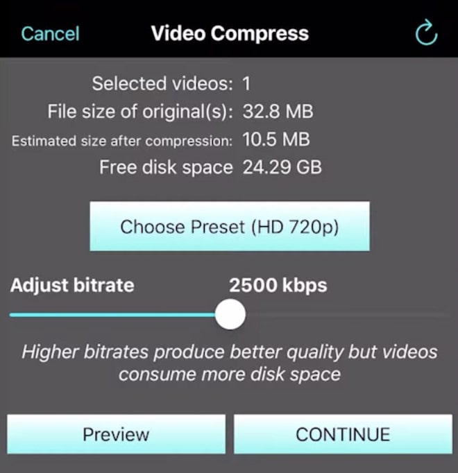Step 5. Preview and tap “CONTINUE” to compress a video for Discord on iPhone.