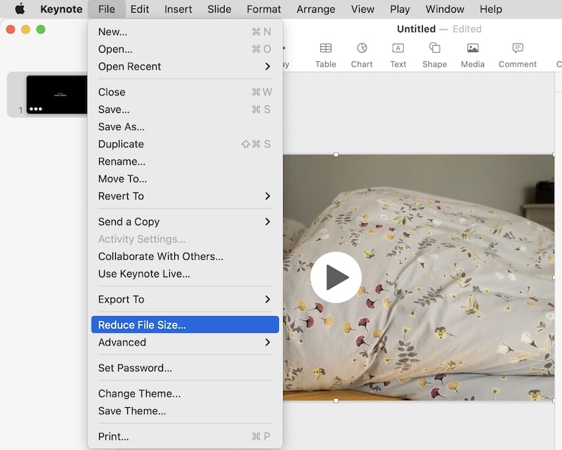 - Highlight the inserted video, go to "File" from the top menu bar and click "Reduce File Size..." option.