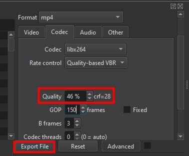 - Reduce the quality percentage from 55% to 46%. The CRF value at this point is exactly 28.