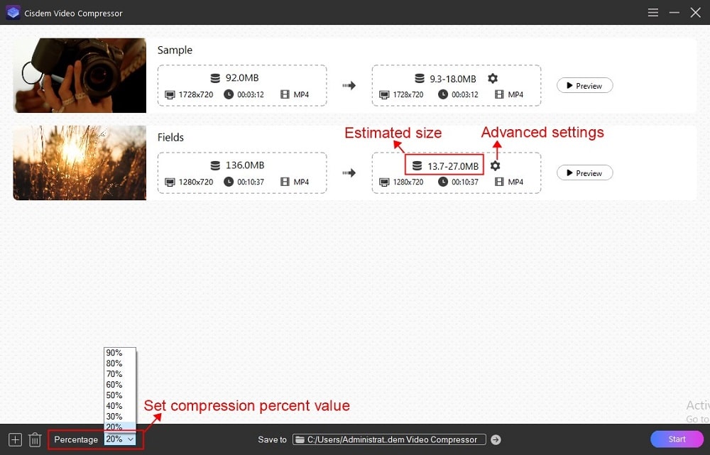 If you're looking to compress videos on Windows instantly with one click, pick the compression percentage directly from the main interface, ranging from 20% to 90%.