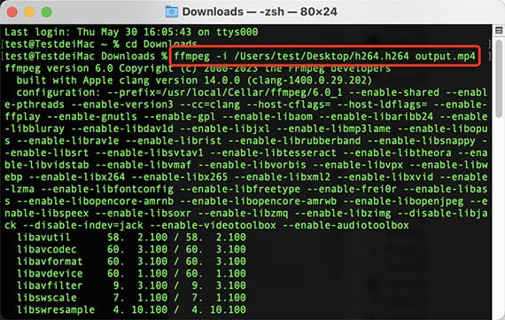 - Enter and run the conversion command in FFmpeg H.264 converter.