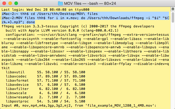 To convert MOV to MP3 in bulk: for i in *.mov; do ffmpeg -i "$i" "${i%.*}.mp3"; done.