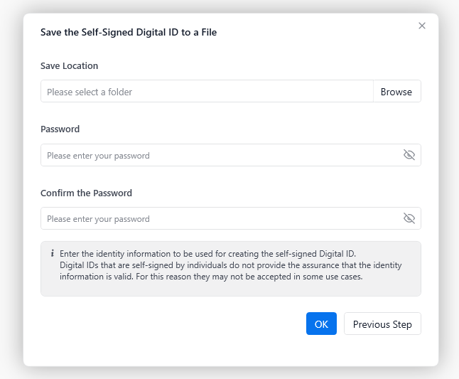 - Choose a file location and enter the password for your new digital ID file. And press OK.