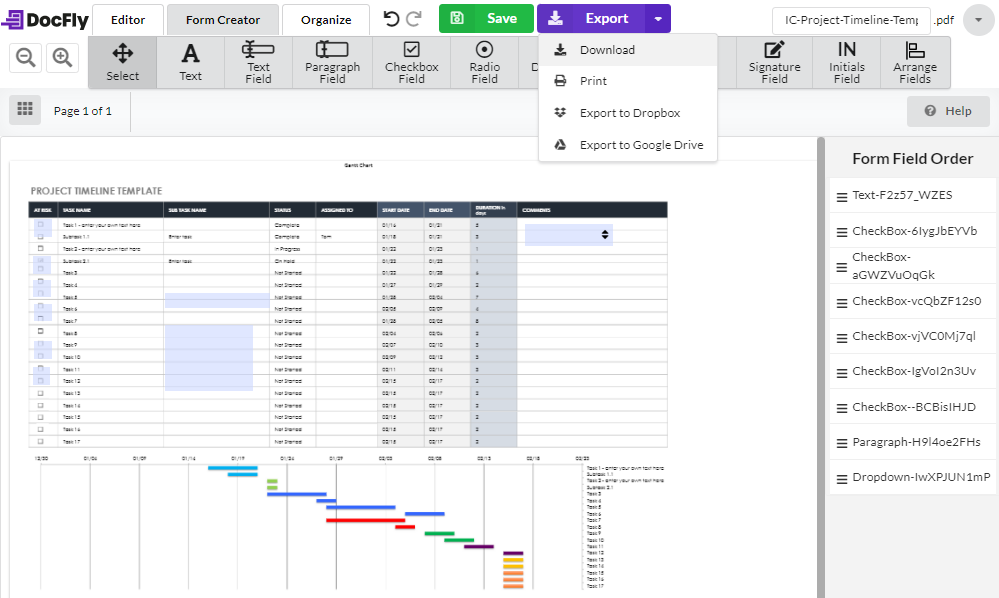 7. When everything is done, click Save, and download the fillable PDF form Export drop-down menu.