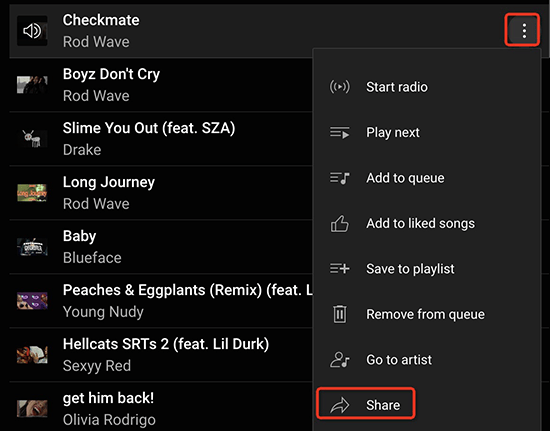 On YouTube Music: Click on the three vertical dots next to the audio > “Share”. From the pop-up dialog box, click “Copy”. To download the whole YouTube Music playlist, copy the link in the address bar.