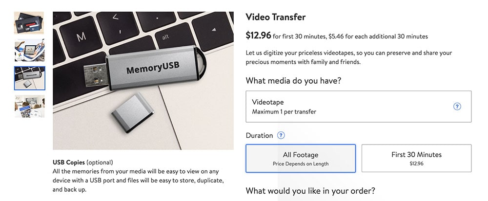 | Walmart Photo | For the first 30 min, $12.96 (digital copy only) + for additional, $5.46/30 min + $12.96/USB | 3 - 4 weeks | USB, digital copy in MemoryCloud (expires in 60 days) |