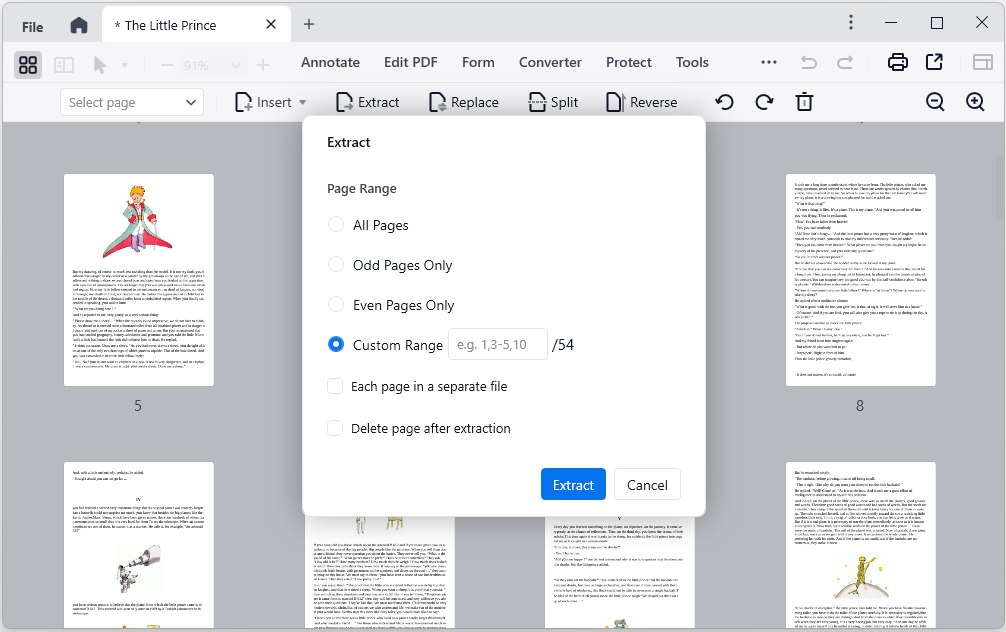 - Step 4. Click Extract, and a new menu bar will show up. If you want to extract pages from a PDF as separate files instead of one PDF, select Extract pages as separate files. If you select Delete Pages after extracting, the extracted pages will be removed from the original PDF.