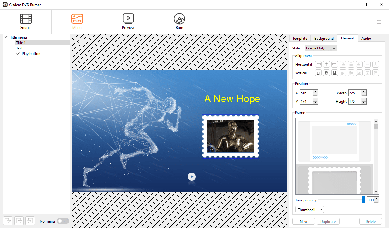 - Subtitle: A New Hope didn't come with subtitles, so I downloaded an English .srt file from a subtitle website and embedded it via Cisdem DVD Burner.