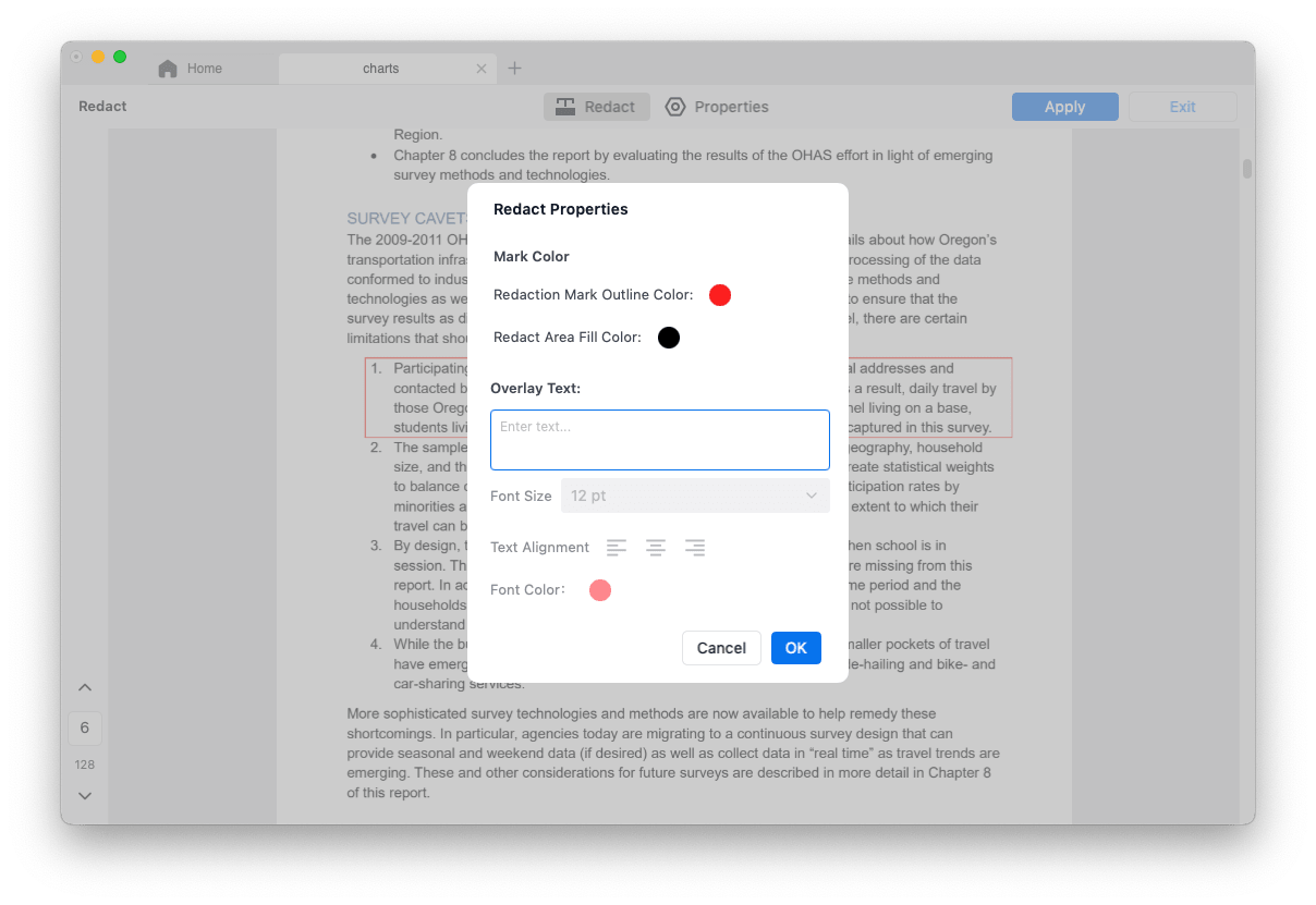 If you worried about the appearance of the redaction or need add comment for the redaction mark, you can click properties and adjust the redaction mark outline color or redact area fill color, also you can use the "Overlay Text" to add a description detailing what kind of information is hidden in the file.
