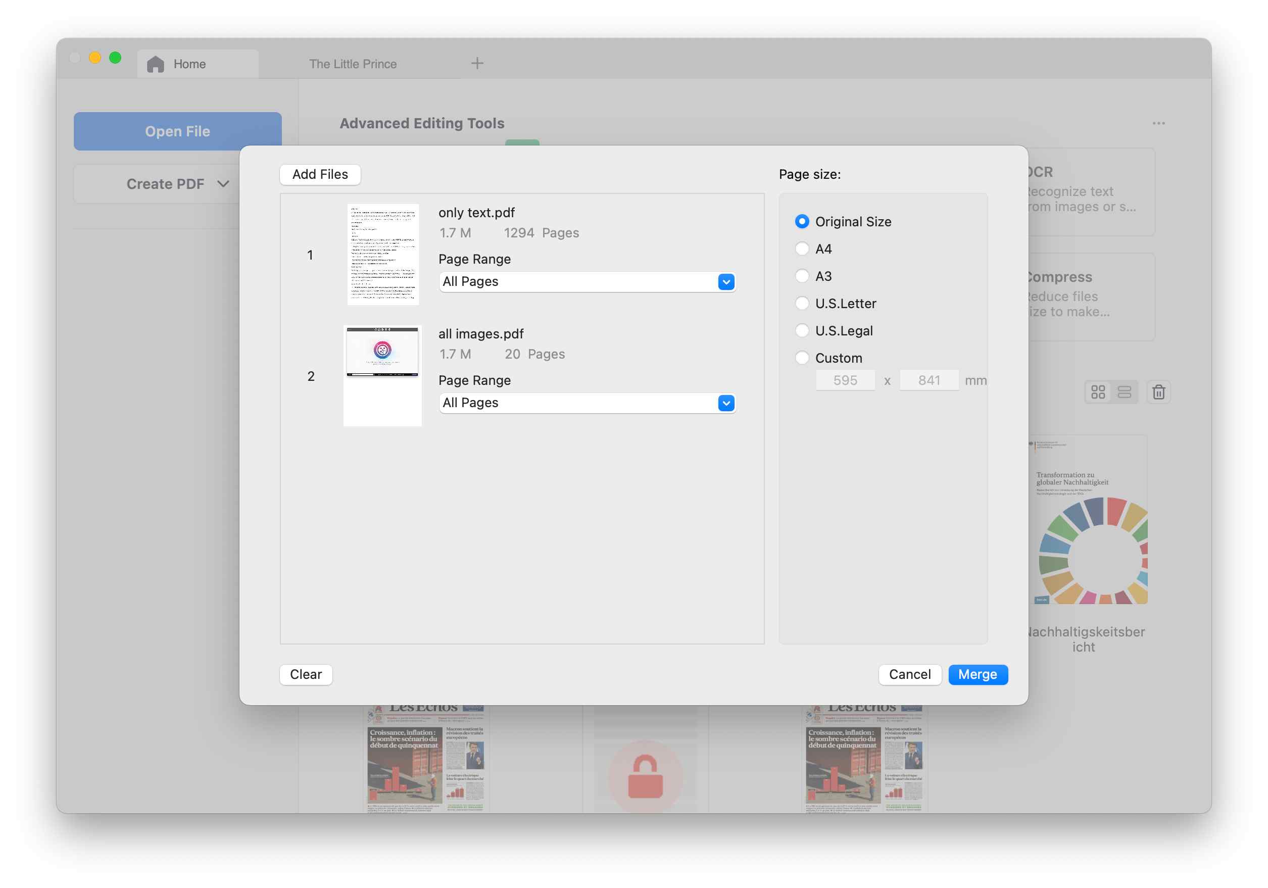 - You can set page ranges for combining and set page size for the merged PDF file, then click Merge to start combining PDF files on Mac.