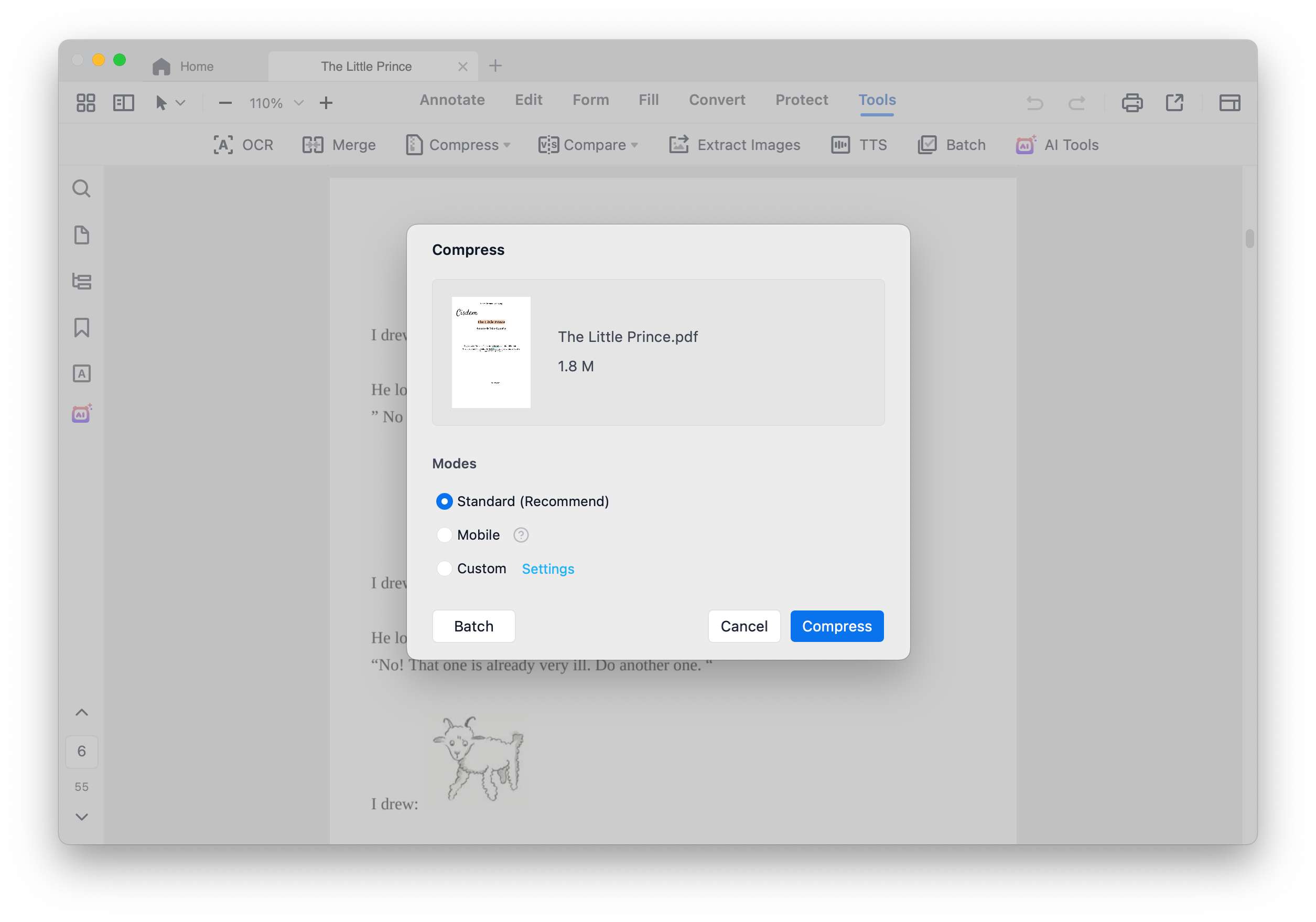 - Go to Tools and choose Compress, you can choose a compress rate that suites you needs.