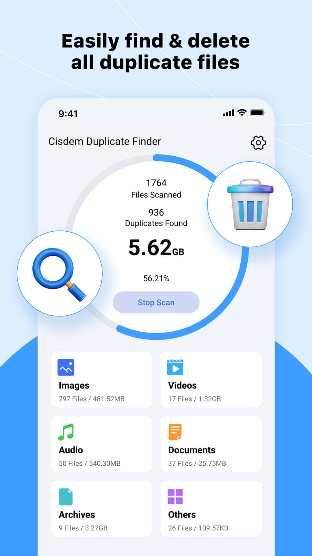 - Identify duplicate photos, videos, audios, documents and other duplicate files