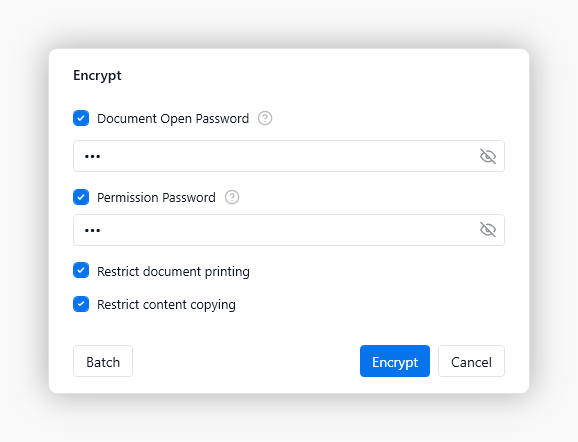 | Password Permission | Open, edit, copy, print, fill form, etc. | Open, edit, copy, print, fill form, etc. | Open, copy, print, fill form | Open | Open, edit, print, copy |