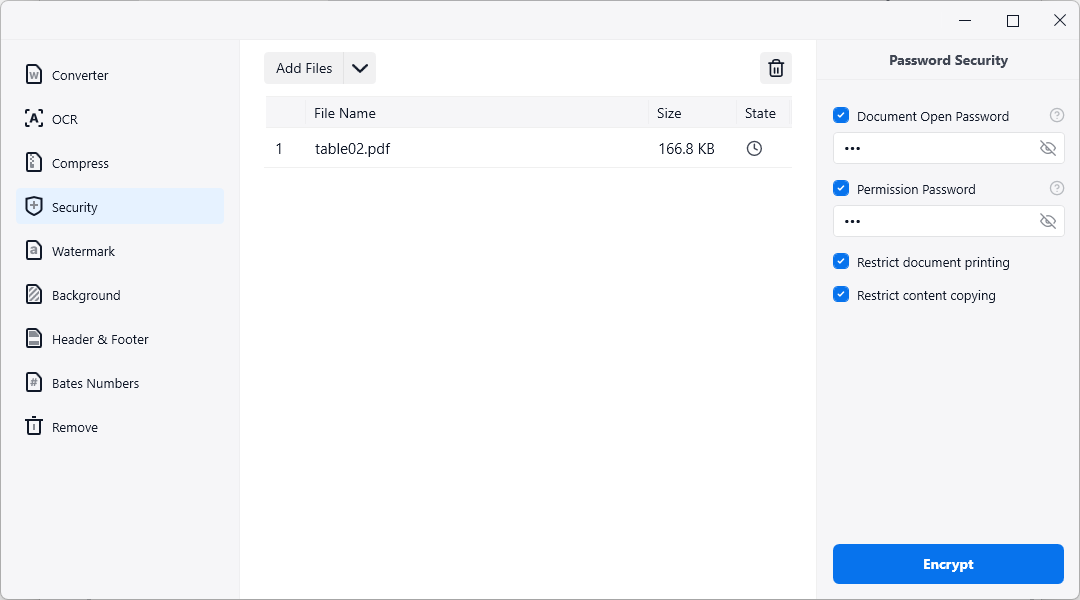- Continue with Encrypt. Choose an output folder to store the locked PDF files.