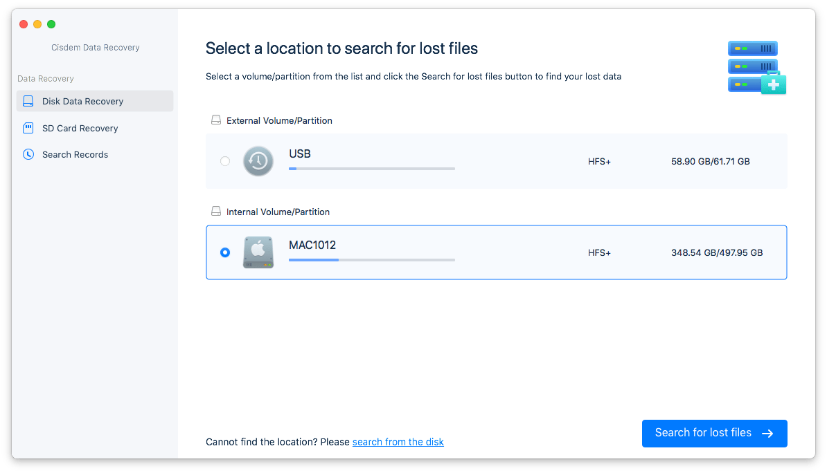 Choose Hardware Disk. Select the exact volume/partition that was used to store your lost iCloud files. Then hit on "Search for lost files" button to start the scanning.cisdem data recovery 01